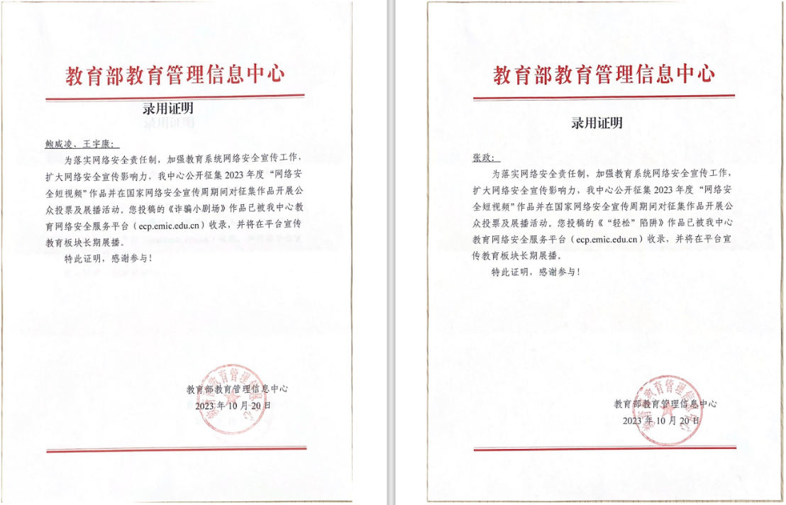 近日,教育部教育管理信息中心发来感谢信,对星空体育中国官方网站积极参加2023年度网络安全短视频征集活动表示感谢,肯定了星空体育中国官方网站选送的4部作品为开展网络安全宣传教育、提高全员网络安全意识起到的积极推动作用。在2023年度“网络安全短视频”作品公开征集及展播活动中,我院4件“网络安全短视频”作品被教育网络安全服务平台(ecp.emic.edu.cn)收录,并将在平台宣传教育板块长期展播。