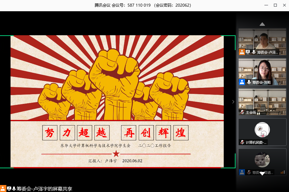 2020年6月2日下午,星空体育中国官方网站第五次学生代表大会以线上会议形式顺利召开。共青团东华大学委员会专职团干部封华,财务处党支部组织委员林子卉,计算机科学与技术学院副院长李锋、党委副书记李华婷、团委书记张政以及全体学生代表出席会议。