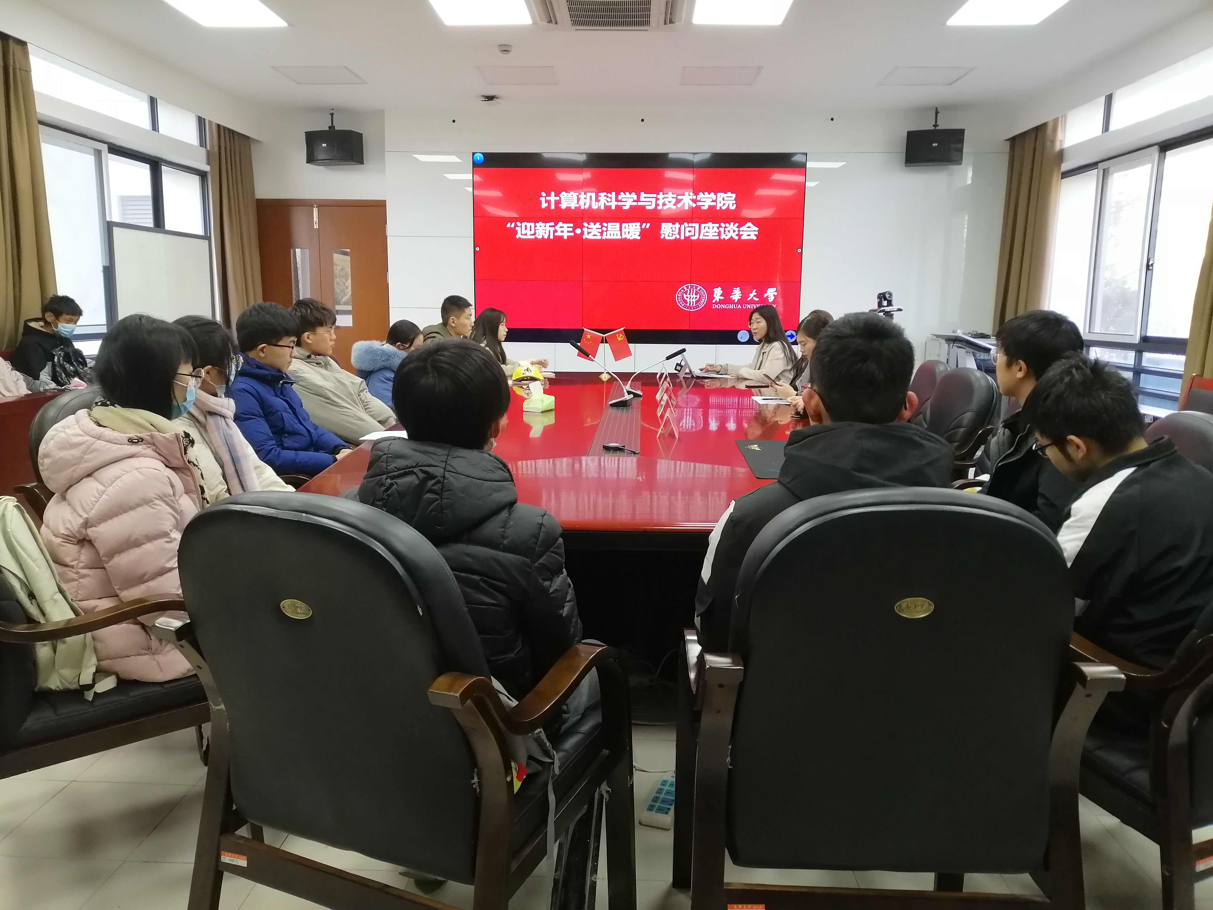 2020年12月30日,计算机科学与技术学院在1号学院楼240会议室召开了“迎新年·送温暖”慰问座谈会。本次座谈会由计算机科学与技术学院学生资助工作负责老师刘欣怡主持,参加座谈会的还有学生办公室主任唐菲菲,20级本科生辅导员姜霖霖、张莉萍,18级本科生辅导员李莉莉以及各年级学生代表。