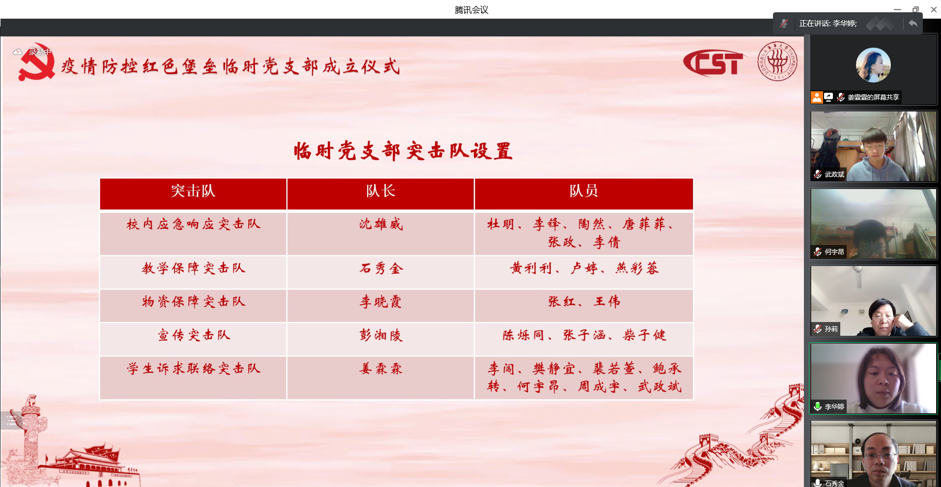 临时党支部依托校内应急响应突击队、教学保障突击队、物资保障突击队、宣传突击队以及学生诉求联络突击队,持续投入疫情防控工作,全力保障学院师生的学习生活。其中,校内应急响应突击队主要确保疫情期间校内应急情况响应,参与送餐引导、核酸检测引导、网格化管理楼内、驻楼志愿者等;教学保障突击队主要确保在疫情期间线上教学的顺利推进,并为在教学或学习科研方面有需要的老师和学生提供切实可行的解决方案;物资保障突击队主要保障在校教师和学生的防疫物资需求和生活物资需求,尽力满足必需的生活物品;宣传突击队主要负责积极宣传防疫知识、积极传播抗疫正能量、积极宣传榜样典型,共同营造科学理性的疫情防控氛围;学生诉求联络突击队主要负责关注同学们的学习诉求、心理健康状况和生活起居需求,按实际情况安排红色助学团成员进行线上一对一帮扶。