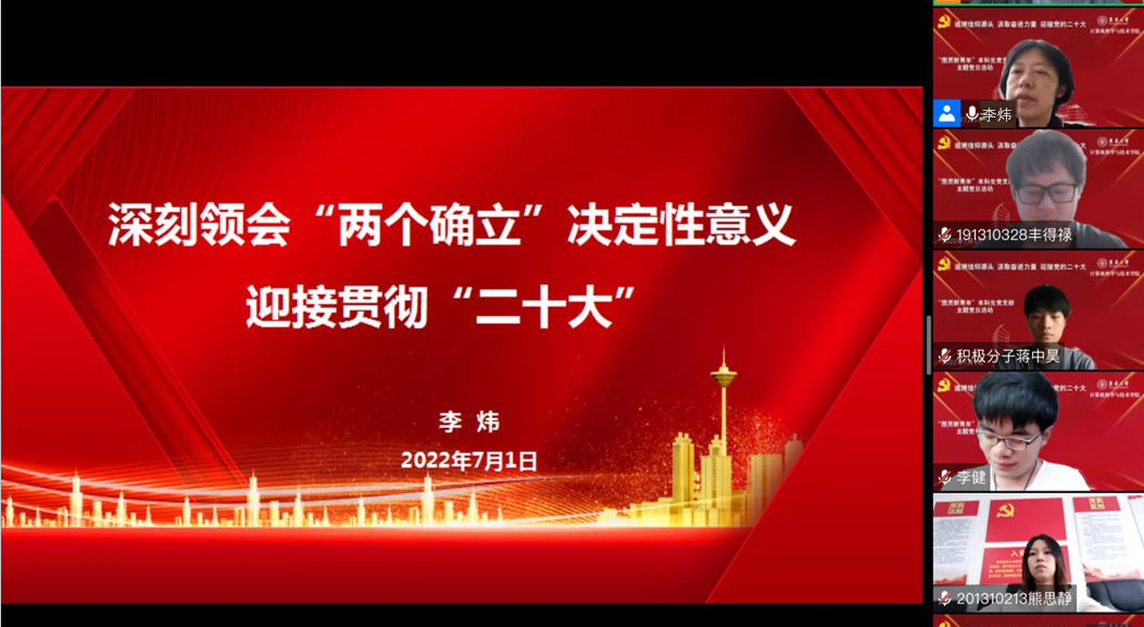 为庆祝中国共产党成立101周年,7月1日,计算机科学与技术学院“图灵新青年”本科生党支部开展“追溯信仰源头,汲取奋进力量,迎接党的二十大”主题党日活动。副校长李炜出席活动并讲党课,学院党委副书记李华婷、党支部全体党员及入党积极分子参与活动。活动由党支部书记姜霖霖主持。