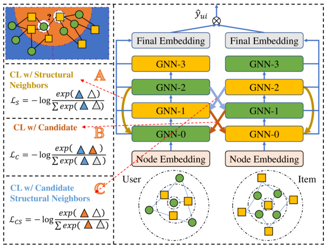 在CGCL中,我们在不同层次的嵌入中探索用户和候选项之间的关系,并使用相似的语义嵌入来构建对比对。通过我们提出的CGCL,我们构建了结构邻居对比学习对象、候选对比学习对象和候选结构邻居对比研究对象,以获得高质量的节点嵌入。