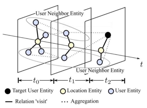 为了克服现有的基于序列和基于Knowledge Graph (KG)的推荐方法的局限性,我们在POI推荐中引入了带有时间信息的知识图(称为TKG),包括用户和带有时间戳的位置。在TKG中,考虑了用户对位置的个人偏好,并使用了注意机制来衡量每个用户对距离和时间的接受程度。在该方法中我们构建了一个包含用户和位置实体的时间知识图,并通过邻居聚合应用用户/位置感受野来捕获它们的动态表示,应用时空间隔感知注意层来利用用户内部和用户之间具有注意机制的时空间隔。