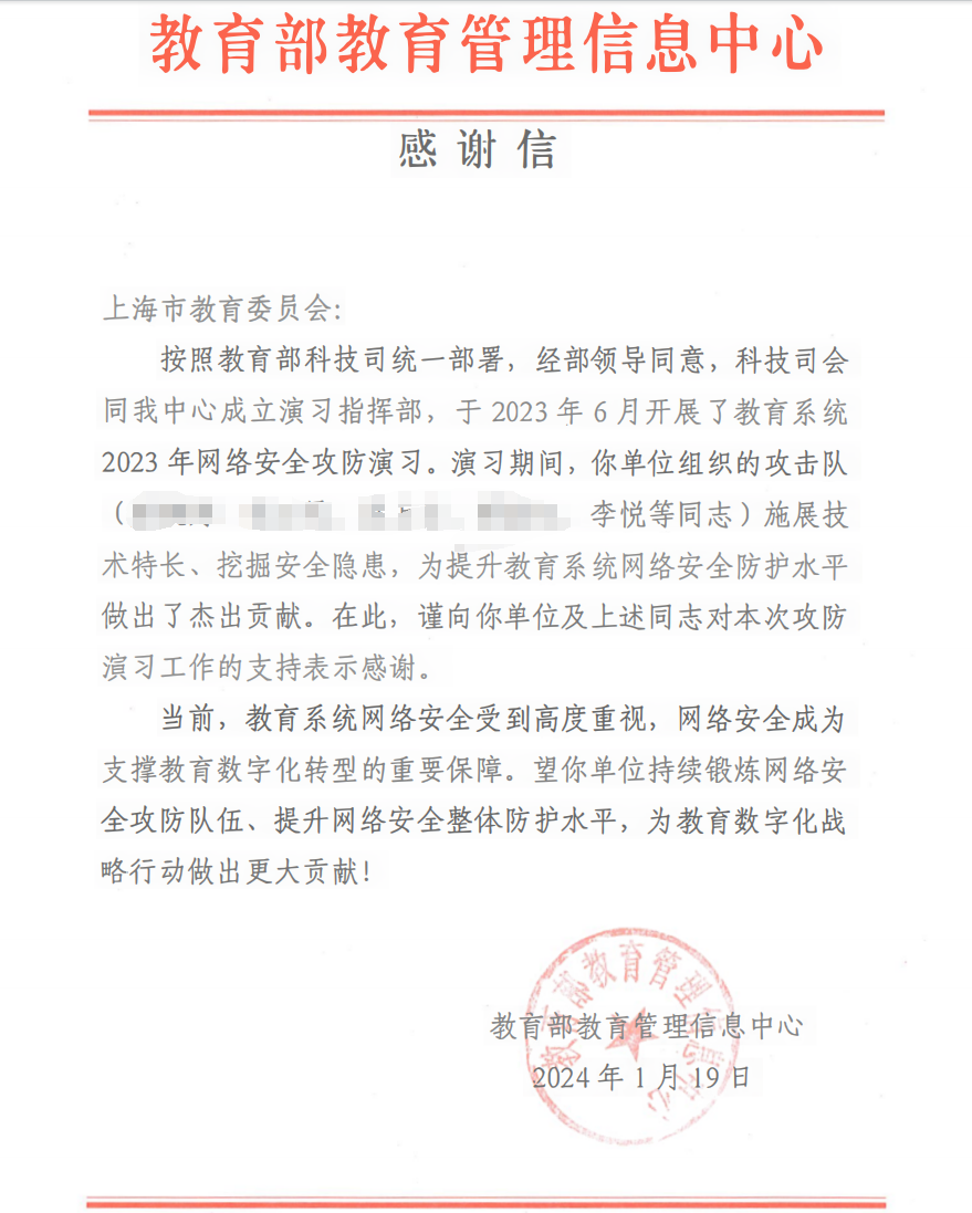 教育系统网络安全受到高度重视,网络安全成为支撑教育数字化转型的重要保障。星空体育中国官方网站李悦老师指导带队的CTF 网络安全竞技社连续两年(2022-2023)派遣选手配合上海市教委组建网络攻击队伍参加教育部组织的全国教育系统护网行动。2023年我院单独组队参加了上海市高校护网行动并取得了杰出战果,为提升教育系统网络安全防护水平做出了贡献。因此教育部教育管理信息中心向上海市教育委员会发出了感谢函,感谢领队老师们的辛勤付出和无私奉献精神,鼓励老师们持续锻炼网络安全攻防队伍、提升网络安全整体防护水平,为教育数字化战略行动做出更大贡献。