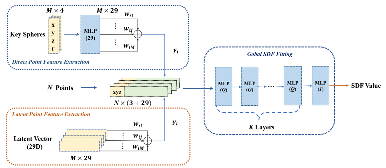 该研究提出利用显式的空间关键球辅助实现三维模型的高保真神经隐式压缩表示与重建,通过在模型内部的SDF场中提取空间关键球,并利用简单的特征聚合网络提取全局形状信息赋予给每个空间点,SDF拟合的精度(同等网络大小下)得到显著提高,或需要的网络参数(同等重建精度下)得到了明显下降。