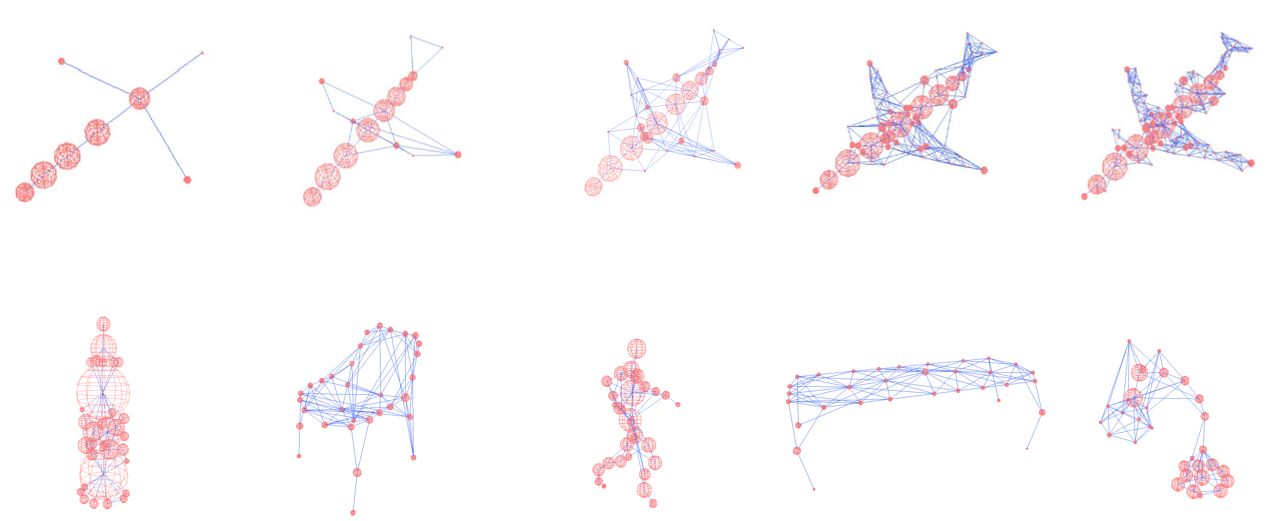 该研究提出了一种极简的三维模型表示方法——球节点图,通过在模型内部的SDF场中确定球心及其半径(SDF值),并建立连边关系形成图表示,三维模型可以用少量基元(如32个)即可展示其几何结构。对球点图利用图神经网络(GNNs)提取并聚合特征,在非旋转模型和旋转模型的分类任务上都取得了当时最好的精度结果。