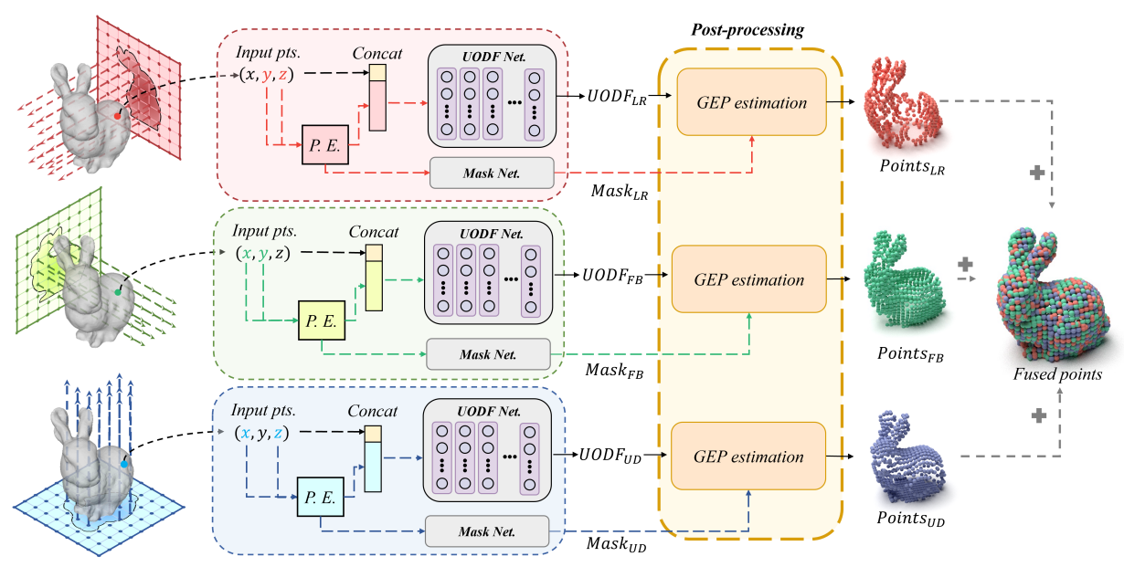 该研究提出一种针对任意三维模型的精确神经隐式表示方法——无符号正交距离场(UODFs),不同于有符号距离场(SDF)和无符号距离场(UDF)中最小距离通过多方向搜索得到,UODFs中的每个点沿着三个正交方向定义距离和直接推理最近表面点(模拟激光的特性),避免引入插值误差从而提升了重建精度。一系列水密、非水密、多孔、组合模型的重建实验验证了本方法的有效性。