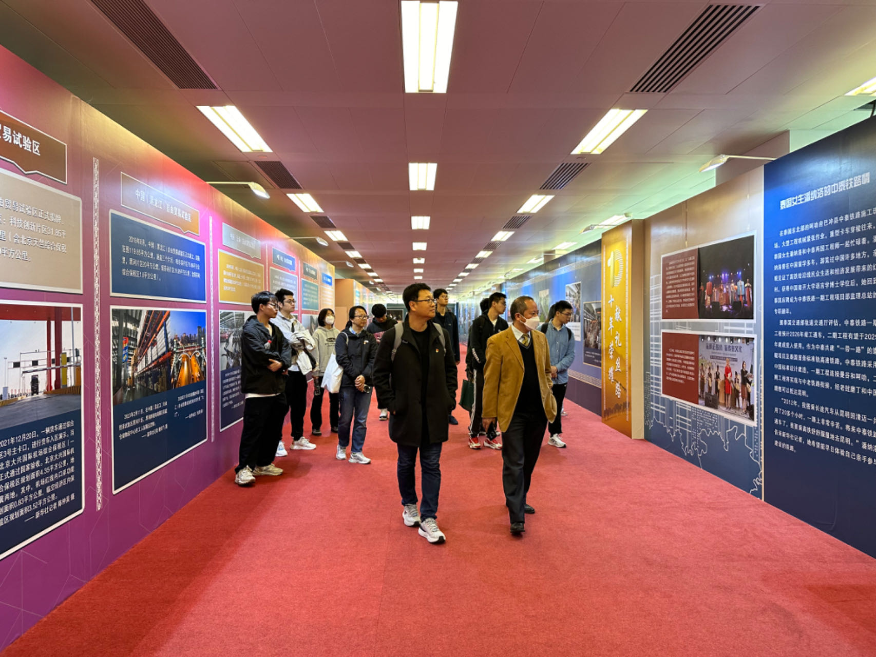 钱强首先带领学院师生参观了位于中心一楼的“总体国家安全观 创新引领10周年”系列宣传海报展和党群服务中心,坚定师生国家安全、你我共筑的责任感,感受城市楼宇党建工作风采。随后,来到位于六楼的“新时代、新高地、新征程——一带一路暨自贸区十周年图片展”,展览围绕“十年荣耀,献礼丝路;十年深耕,蓬勃兴起”两大主题展出了200幅记载历史的作品,驻足一幅幅生动的图片前,钱强讲述了从基础设施建设到文化交流、从贸易往来到金融合作的各项重大成就,向学院师生展现了中国与沿线国家合作共赢的生动场景及十年来“一带一路”波澜壮阔的历史画卷,大家对“一带一路”倡议有了更深刻的理解,对我国在国际舞台上的积极作用感到自豪。