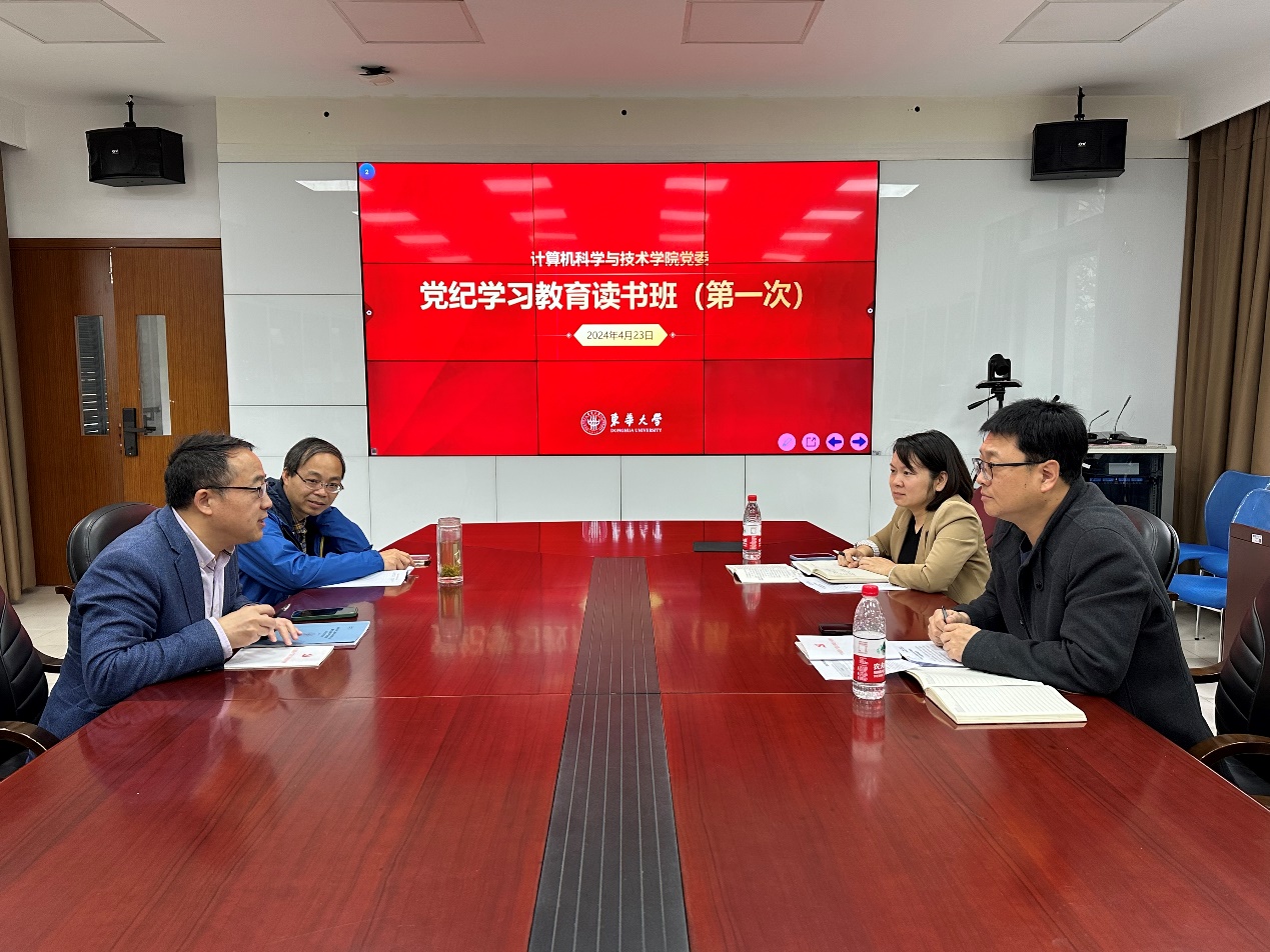 4月23日,计算机科学与技术学院党委党纪学习教育读书班开班暨举行第一次集中学习研讨会,学院党委书记杜明、院长方志军、副书记李华婷、副院长石秀金参会,杜明主持学习会。