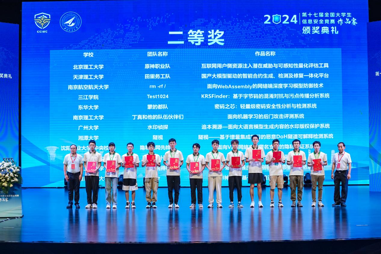 8月11日至14日,第十七届全国大学生信息安全竞赛作品赛决赛在西北工业大学太仓智汇港顺利举办。经过激烈角逐,我院信息安全专业本科生周琪玮、黄佳音和连晟在比赛中荣获全国二等奖。