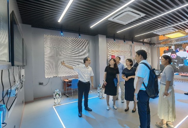 接着,专家组对示范中心的综合创新实验室、服务器机房和校企联合实验室进行了考察。在综合创新实验室,专家们与机器人NAO进行了趣味互动,对无人机和智能小车等创新实验项目的开展情况进行了深入了解。在服务器机房,专家们对机房的建设规模、运维管理及未来发展规划给予了充分肯定,并就如何进一步提升实验教学资源的使用效率和管理水平提出了宝贵建议。