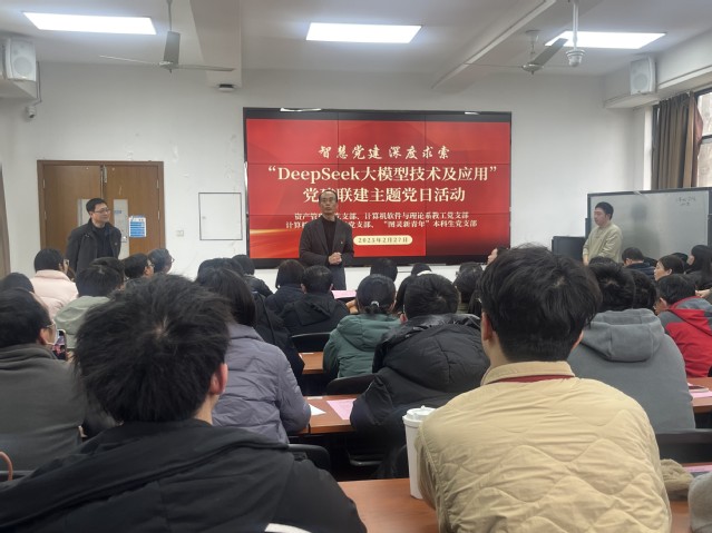 2025年2月27日下午,计算机科学与技术学院140会议室座无虚席,一场围绕“DeepSeek大模型技术及应用”的学习与研讨活动在如火如荼的开展着。活动由计算机信息系教工党支部、计算机软件与理论系教工党支部、资产管理处党支部以及“图灵新青年”本科生党支部联合举办,旨在通过党建联建,推动党建工作与业务工作的深度融合,促进各支部之间的交流与合作。副校长阎林平、各支部党员代表、机关部处及兄弟学院师生等出席活动。