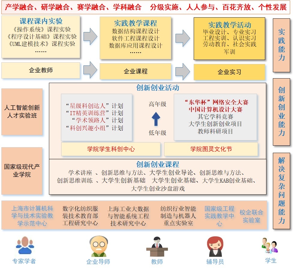 理念层面,根据学校人才培养定位,围绕计算机类人才培养目标和创新型计算机通识教育要求,明确了“夯实基础,跟踪前沿,注重实践,鼓励创新,德智体美劳全面发展”育人理念,以高水平实验教学支撑高质量人才培养工作。